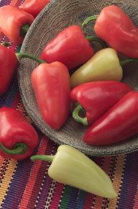 Italian 'bull's horn' colorful sweet peppers are 8 to 10 inches long and curved like a bull's horn. Ripen to deep red or bright yellow and are delicious fresh in salads, but more often are sauted or grilled. Prolific tall plants. 68 days.