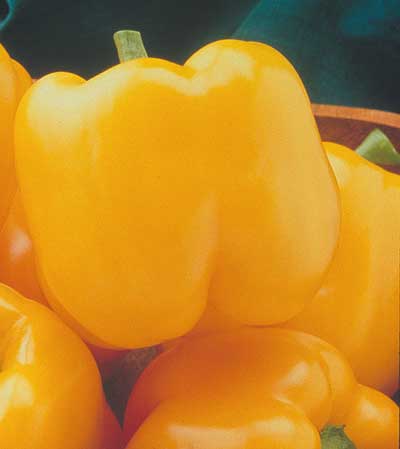 Big, blocky bell peppers are a mature green in 70 days, then turn to a beautiful shade of golden-yellow in just two more weeks. The peppers are about 4-1/2 inches long and nearly that wide, and are smooth and consistently well shaped. As a bonus, plants are tolerant to most pepper virus diseases and 3 races of bacterial spot. Extra sweet when fully yellow.