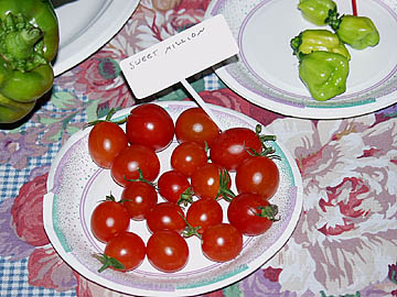 Indeterminate, 57 days. "Very sweet, bright orange cherry tomatoes taste not just sugary but also fruity and delicious. Vigorous growers, these tall plants bear long clusters of fruit." A taste test winner at Rose Loveall's Morningsun Herb Farm. Tried it in 2003...and it turned out to be a winner in the August trials here! Outclassed in 2007 by Sweet Gold, but still a good cherry tomato.