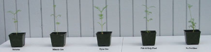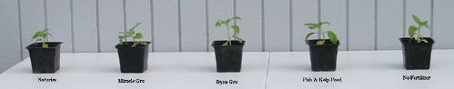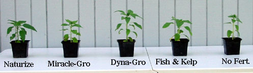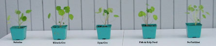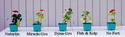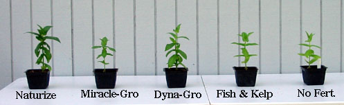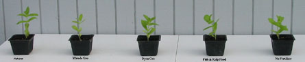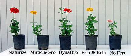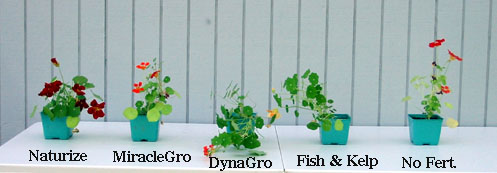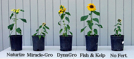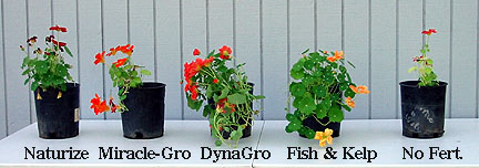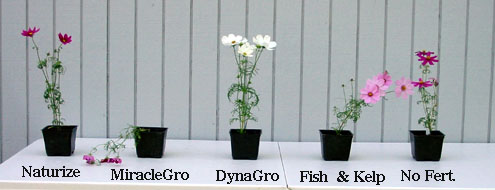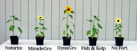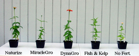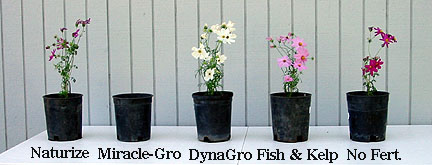Can Naturize duplicate its victory from last year, using annuals instead of tomatoes? Four different plants and four different fertilizers, including Naturize, are in contention in 2004. Plants: Nasturtium 'Whirlybird Mix' (Park Catalog Height at Maturity: 14-16") Cosmos 'Sonata' (Park Catalog Height at Maturity: 24") Sunflower 'Music Box' (Park Catalog Height at Maturity: 28") Zinnia 'Peter Pan' (Park Catalog Height at Maturity: 12") Fertilizers for Test: Naturize 15-8-10 (dosage: 1/4 tsp, once a month) Miracle-Gro 15-30-15 (dosage: 1 tsp per gallon water, every two weeks) Dyna-Gro 7-9-5 (dosage: 2 tsp per gallon water, every two weeks) Fish & Kelp Food 3-2-2 (Ellie's Ultimate Plant Food) (dosage: 3 T per gal. water, every 2 weeks). Control: No fertilizer Soil Mix For Plants: 40% organic compost, 40% peat moss, 20% perlite (pH-6.3) First Fertilization: 3/26/04; Second Fertilization: 4/9/04 (Miracle Gro, Dyna Gro, Fish & Kelp only) Third Fertilization: 4/24/04 (Naturize, Miracle Gro, Dyna Gro, Fish & Kelp) Fourth Fertilization: 5/8/04 (Miracle Gro, Dyna Gro, Fish & Kelp only)