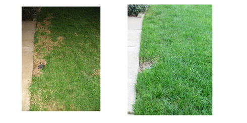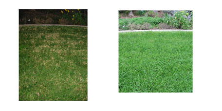 Take a look at these "before and after" pictures, taken just 24 days apart this March. During the winter, our Northern California fescue lawn took a beating, from freezing weather and heavy rains. The pictures on the left were taken just before applying Naturize 15-4-7 Microbial Fertilizer for Lawns. The pictures on the right: the same lawn areas, just a little more than three weeks later. No other fertilizers or soil amendments were added during this time period. It was Naturize that greened up the lawn!