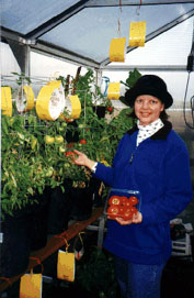 Jeanne, in the greenhouse, picking tomatoes on New Year's Day!(Those yellow cards? Sticky traps for the whiteflies!)